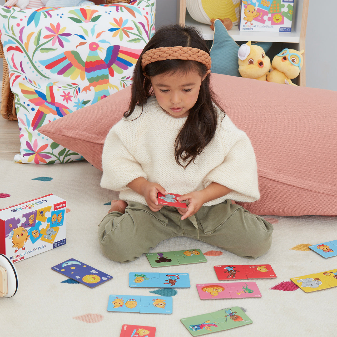 Match each puzzle piece to its opposite, building bilingual vocabulary along the way. Completely reversible, these 10 sturdy puzzle pairs allow your little one to learn opposites in English and Spanish.