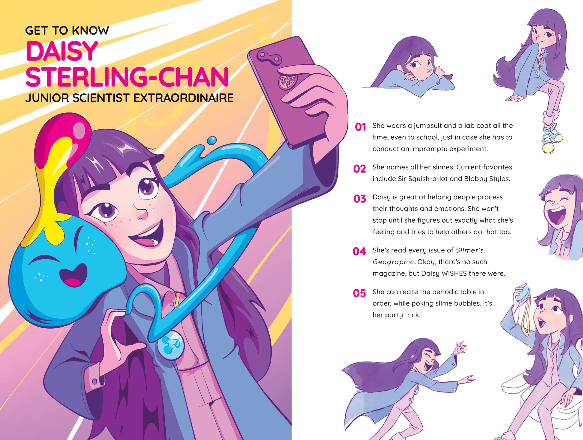 Meet Daisy Sterling-Chan, an eleven-year-old with a serious slime obsession and a love of STEM. Daisy idolizes brilliant slime scientist Miss Joon, who vanished a decade ago. Convinced Miss Joon—and the playful slime-based life form she created, Sloomoo—are still out there, Daisy teams up with cute, cool, quick-thinking Ren Tanaka to bring back the magic.